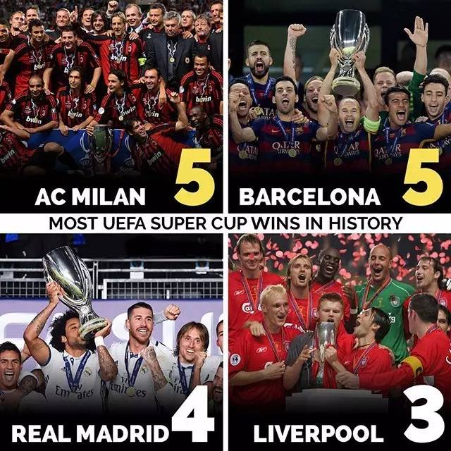 【4】皇马4次夺得欧洲超级杯(近4年3冠),超过利物浦(3),仅次于巴塞罗那和AC米兰(均为5冠)